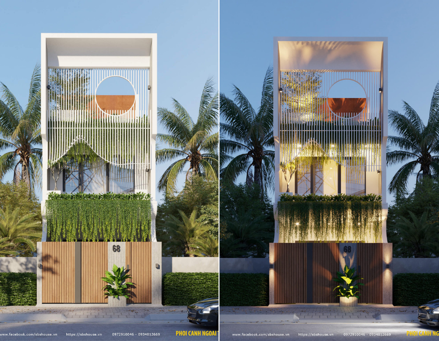 Mặt tiền nhà 2 tầng hiện đại và nổi bật với vật liệu gỗ conwood, cây xanh